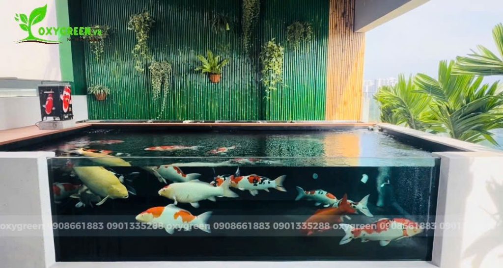 Thẩm mỹ cao: Lớp kính trong suốt giúp phô bày vẻ đẹp rực rỡ của đàn cá Koi, tạo điểm nhấn nổi bật cho không gian.