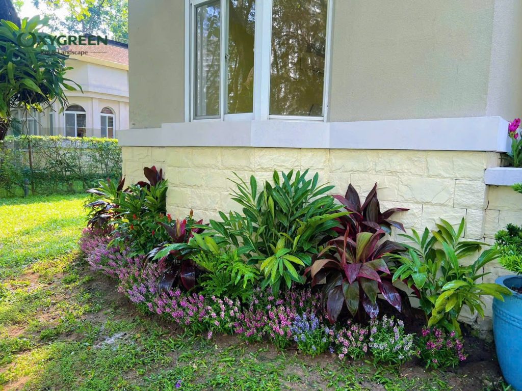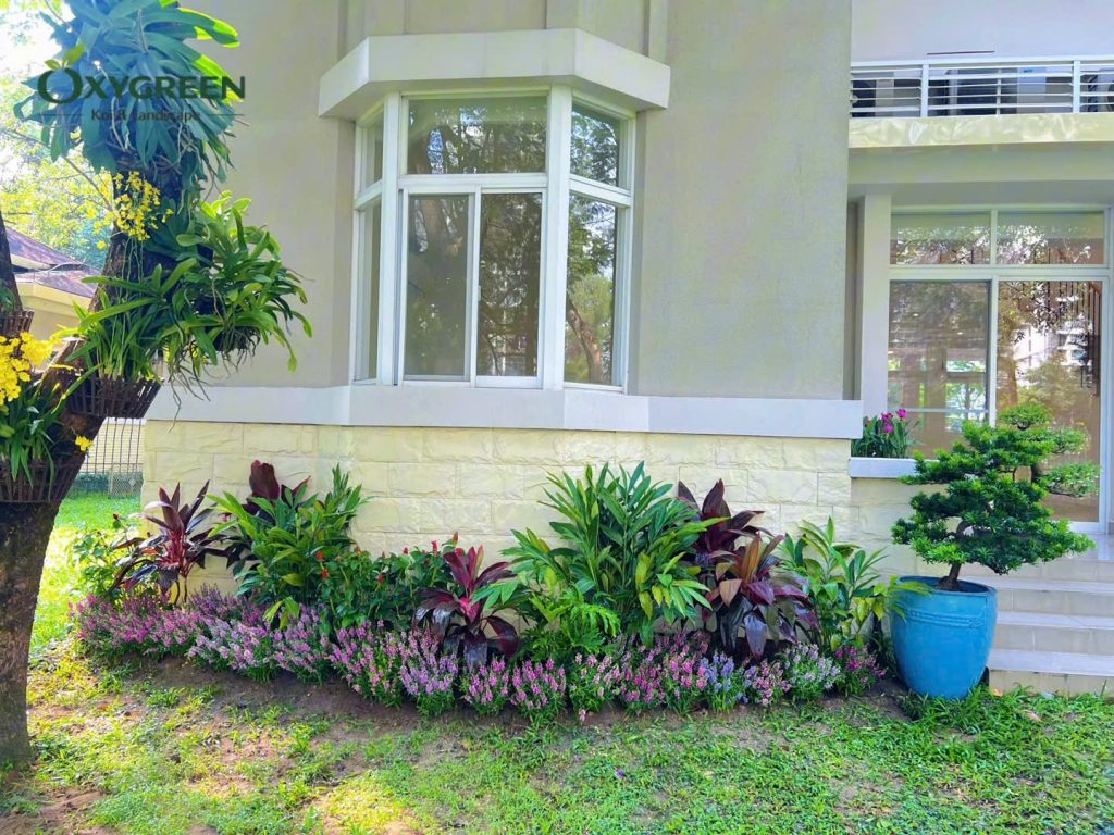 Phần lớn diện tích cải tạo nằm ở các bồn cây chạy dọc theo chân tường biệt thự. Thay vì chỉ trồng một vài loại cây đơn lẻ, Oxygreen bố trí hệ cây theo dạng tầng lớp cảnh quan, giúp khu vườn nhìn đầy đặn và tự nhiên hơn.