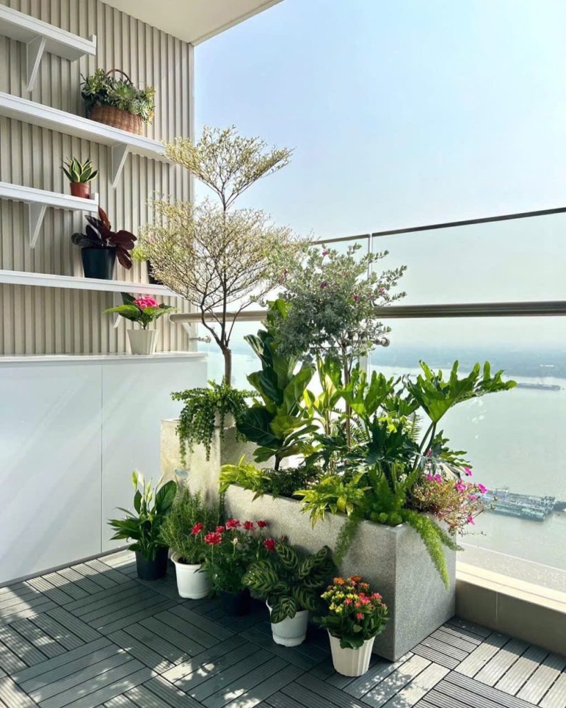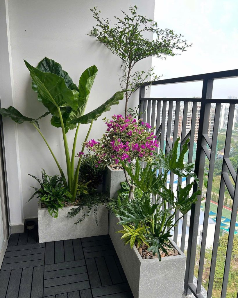 Ban công là khu vực thích hợp để bố trí chậu xi măng trồng cây, giúp đưa mảng xanh lên cao mà vẫn giữ được sự gọn gàng cho không gian sinh hoạt. Chậu xi măng thường được đặt sát lan can hoặc dọc theo mép ban công, tạo thành một dải xanh liên tục, vừa làm mềm kiến trúc vừa tạo cảm giác thoáng mát.
