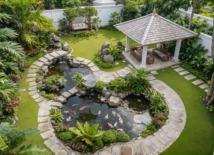 So với trước nhà, khu vực phía sau thường thoải mái hơn trong thiết kế. Hồ cá Koi có thể kết hợp cùng thác nước, hòn non bộ, cầu gỗ, cây bonsai, đá tự nhiên hoặc đèn trang trí… để tạo nên một khu vườn thu nhỏ sinh động ngay trong chính ngôi nhà của bạn.