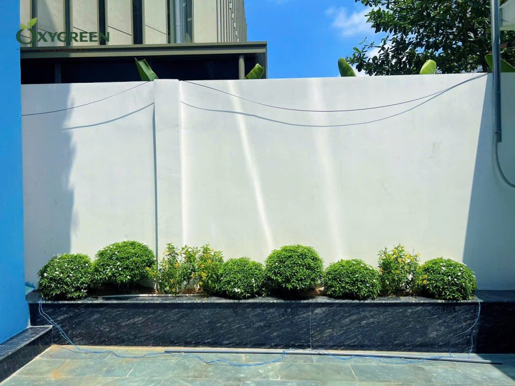 Trong quá trình thi công, hệ chậu và bồn trồng được lựa chọn theo phong cách hiện đại, kích thước phù hợp với từng vị trí cụ thể. Toàn bộ khu vực đều được xử lý kỹ về thoát nước nhằm đảm bảo không bị ứ đọng trong quá trình sử dụng lâu dài. Các chi tiết hoàn thiện được căn chỉnh đồng bộ với kiến trúc tổng thể của ngôi nhà, mang lại cảm giác gọn gàng và tinh tế.