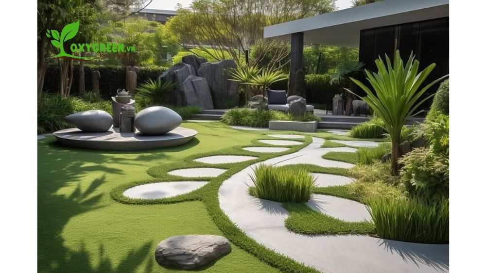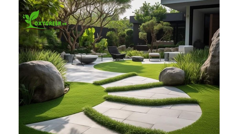 - Lối đi và vật liệu lát nền: Lối đi lát đá hoặc gạch lát sỏi là một trong những yếu tố tạo nên phong cách hiện đại cho sân vườn. Vật liệu lát nền không chỉ đảm bảo sự bền bỉ mà còn góp phần định hình không gian, tạo sự liên kết giữa các khu vực trong vườn.