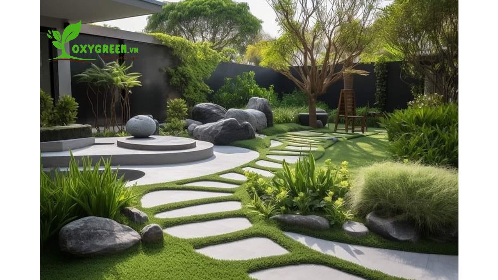 - Sân vườn kiểu Nhật hiện đại: Tinh tế, yên tĩnh và tôn trọng sự hài hòa giữa thiên nhiên và con người, sân vườn Nhật Bản kết hợp giữa các yếu tố như đá, nước, cây cảnh bonsai. Điểm nhấn của phong cách này là sự tối giản và thiên về tính thiền định, rất phù hợp cho những ai muốn tạo không gian yên bình trong nhà phố.