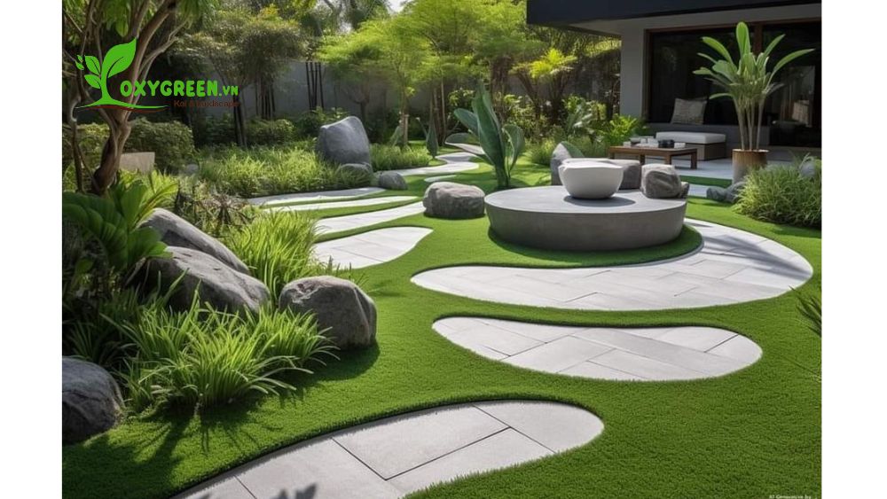 - Lối đi và vật liệu lát nền: Lối đi lát đá hoặc gạch lát sỏi là một trong những yếu tố tạo nên phong cách hiện đại cho sân vườn. Vật liệu lát nền không chỉ đảm bảo sự bền bỉ mà còn góp phần định hình không gian, tạo sự liên kết giữa các khu vực trong vườn.