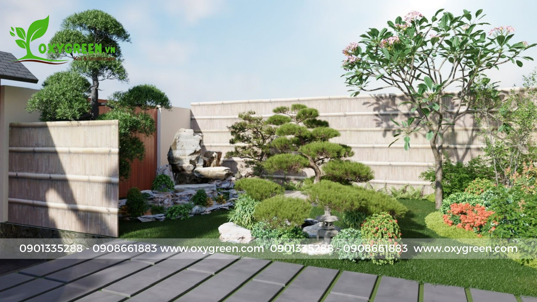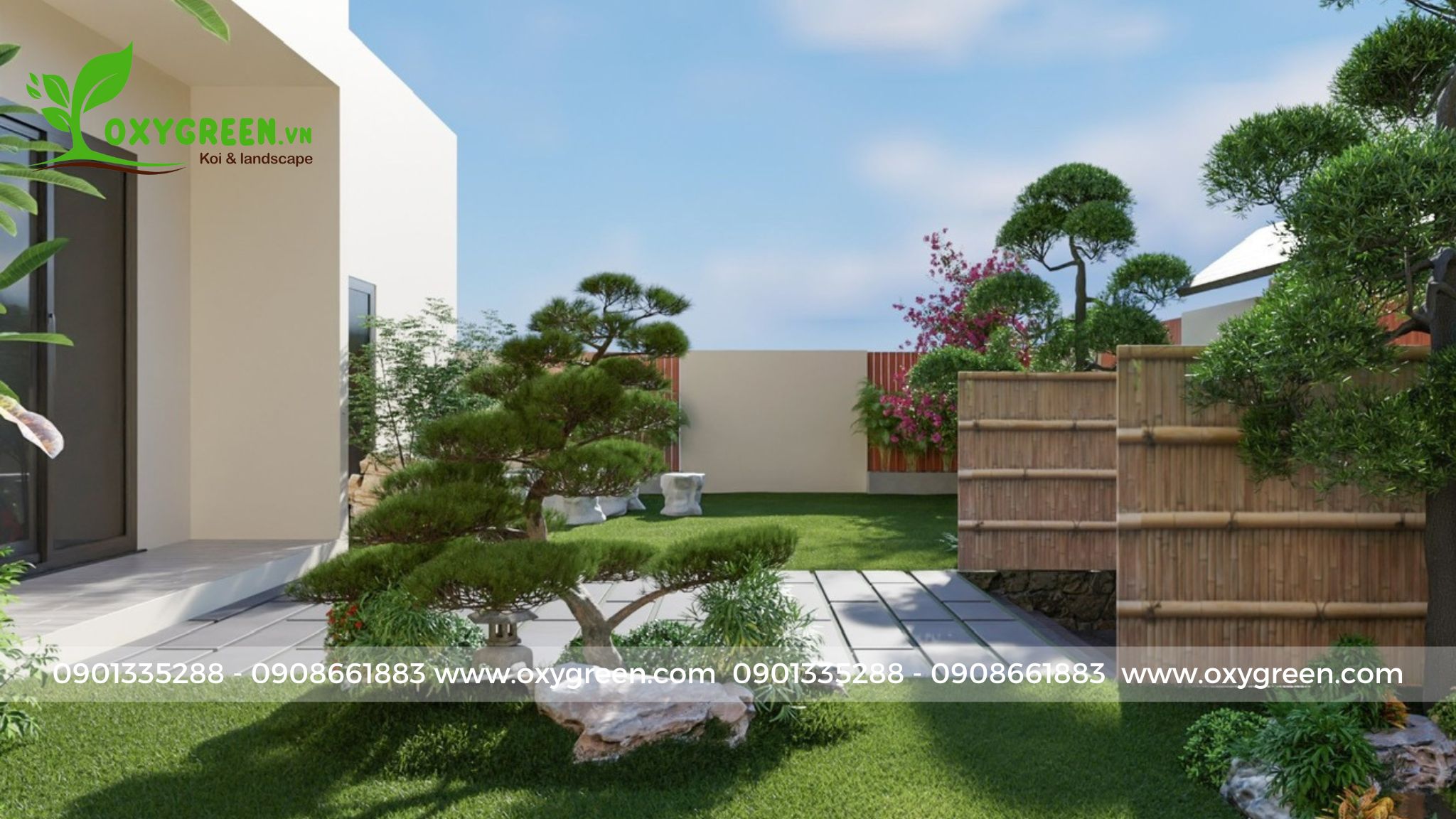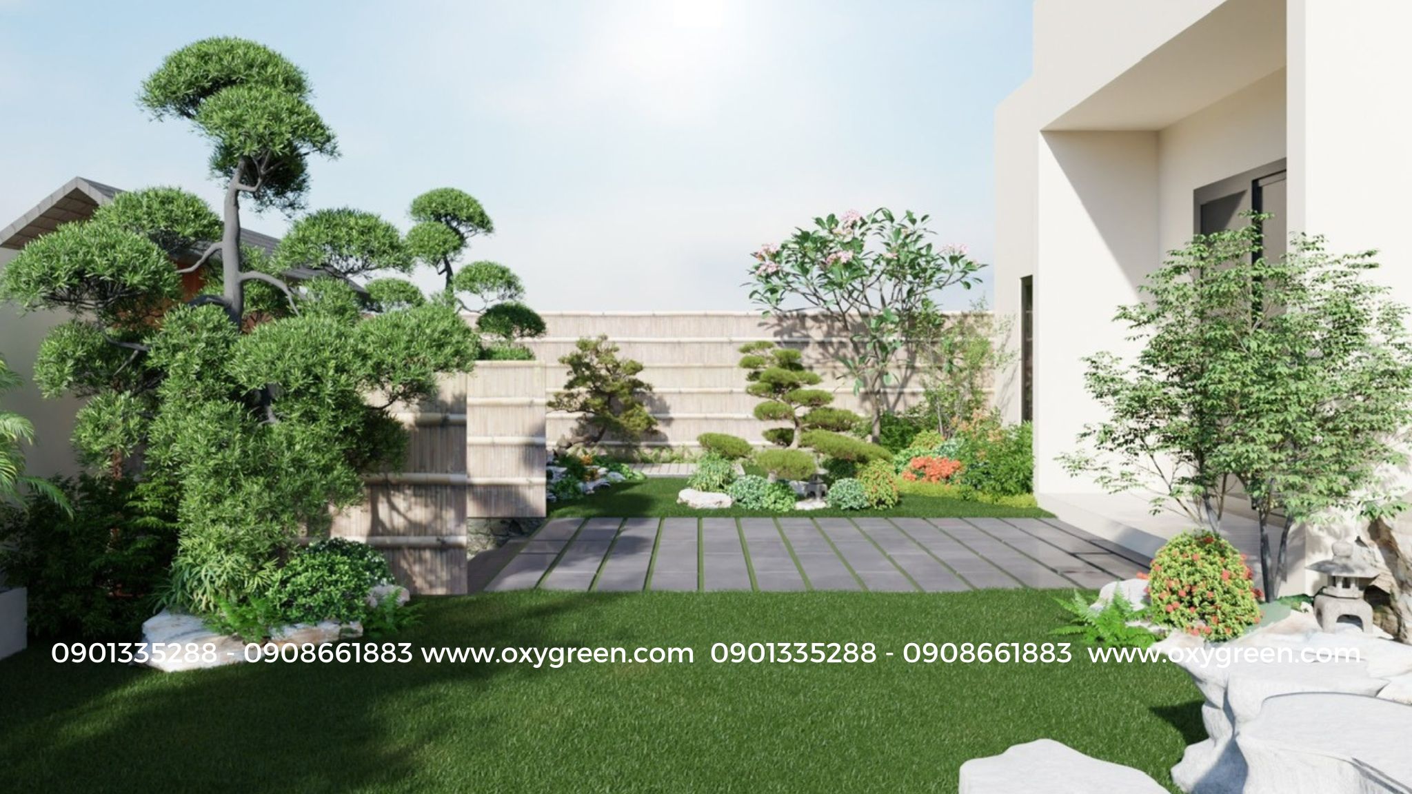 Oxygreen tập trung vào sự đơn giản nhưng không kém phần sắc sảo, tỉ mỉ trong từng chi tiết của thiết kế. Mẫu sân vườn kiểu Nhật này sử dụng các loại cây cảnh phù hợp với phong cách Nhật Bản, kết hợp với những mảng cỏ xanh mướt, tạo nên một không gian xanh, thoáng đãng và thư giãn.