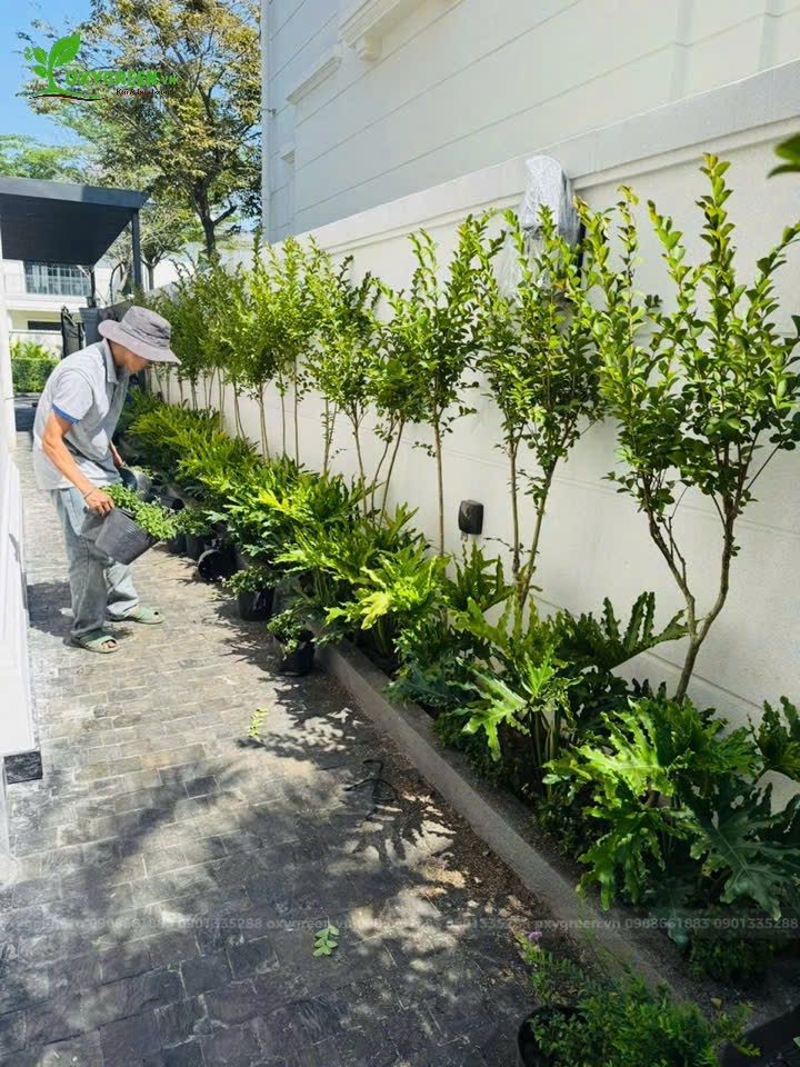 Sau khi khảo sát và thống nhất phương án, đội ngũ thi công bắt đầu cải tạo lại toàn bộ bồn cây dọc theo tường rào và lối đi. Anh em tiến hành xử lý đất trồng, bố trí cây theo từng tầng cao – thấp để tạo chiều sâu cho không gian.