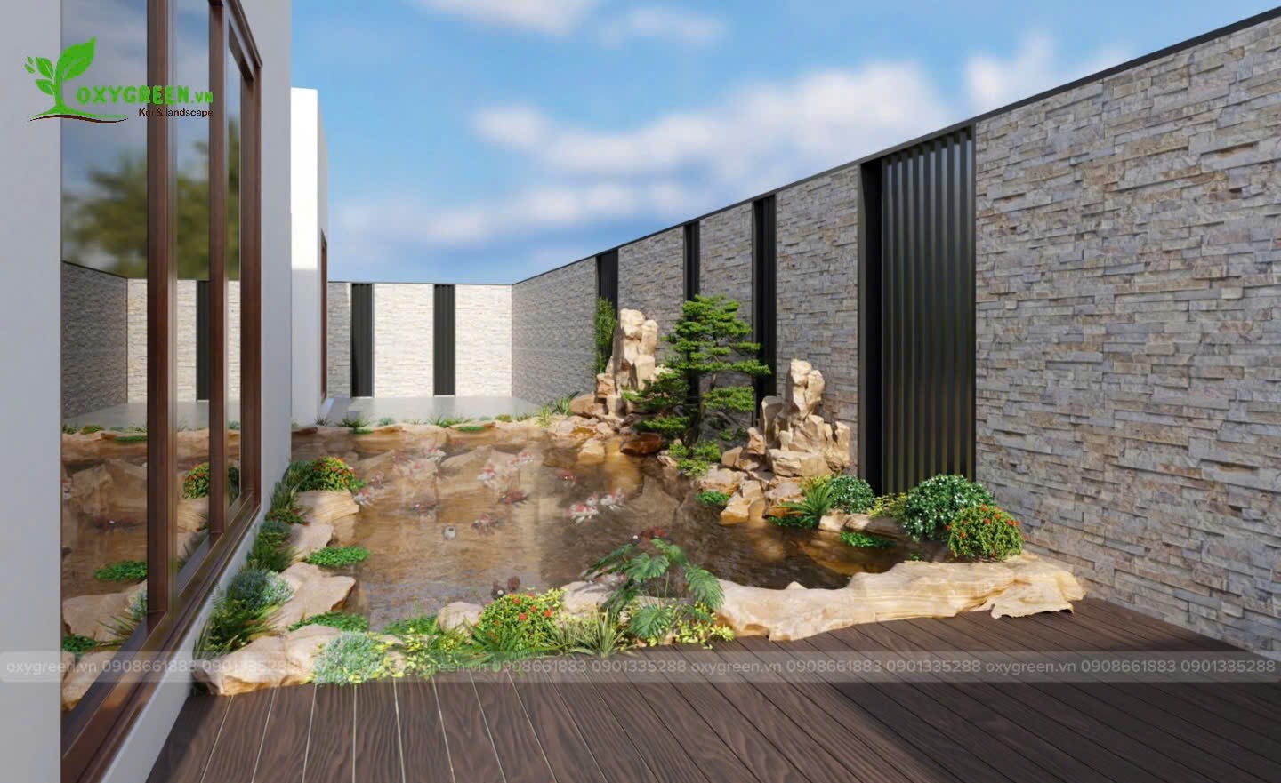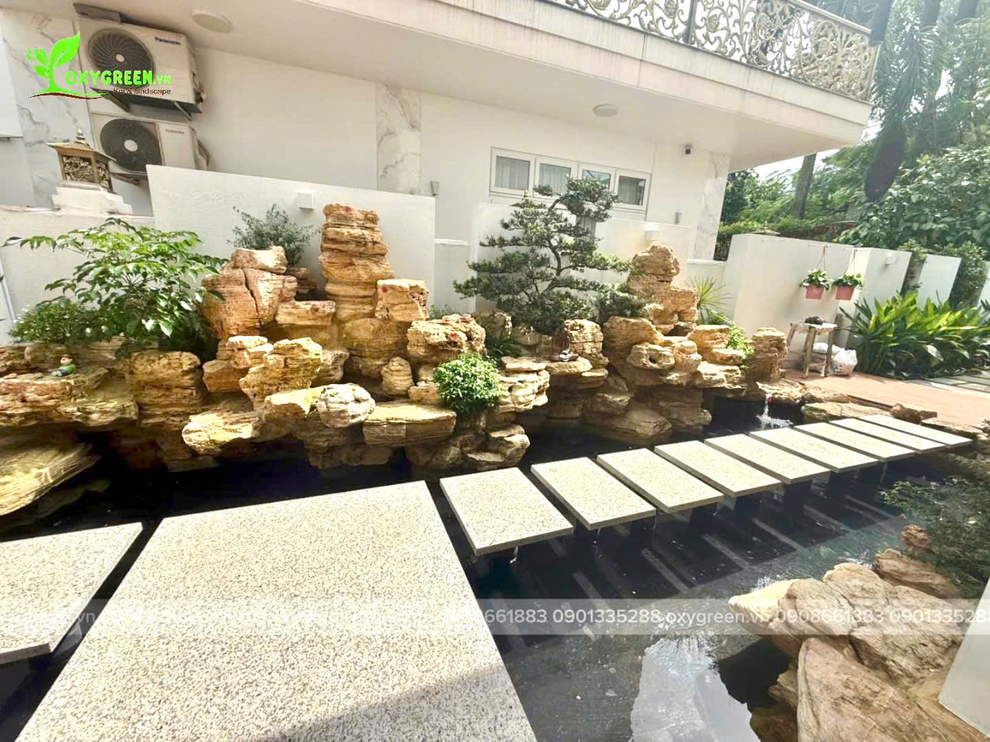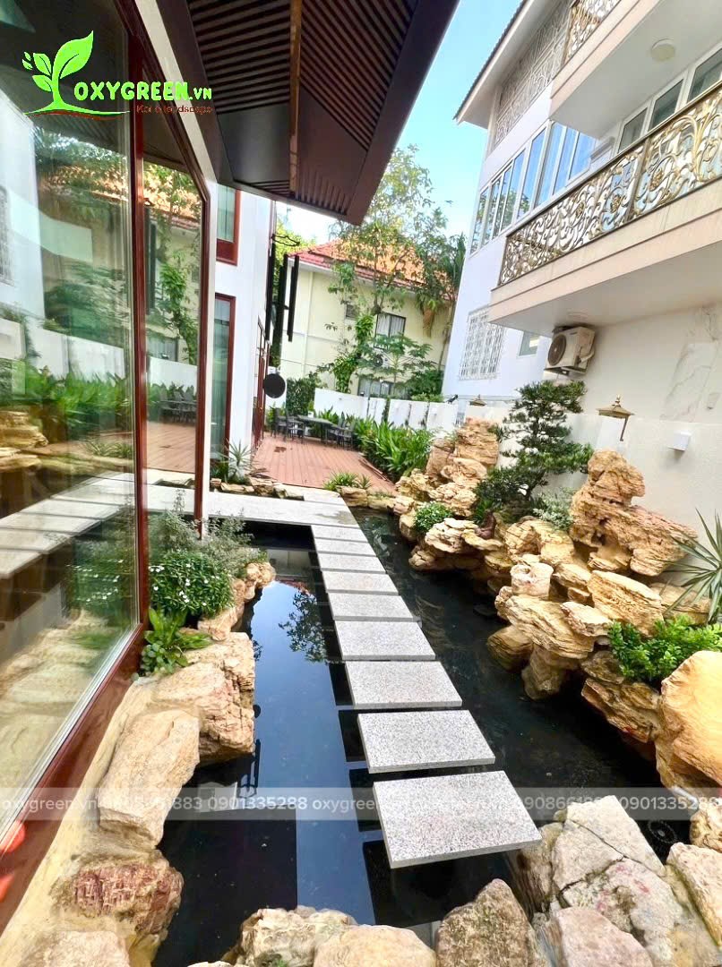 Công trình dưới đây là một dự án thực tế do Oxygreen trực tiếp khảo sát hiện trạng, lên phương án thiết kế theo không gian nhà phố và thi công trọn gói tại công trình. Toàn bộ bố cục hòn non bộ, hồ cá Koi và lối đi được triển khai đồng bộ ngay từ đầu, đảm bảo tính thẩm mỹ, sự hài hòa với kiến trúc và thuận tiện trong quá trình sử dụng lâu dài.