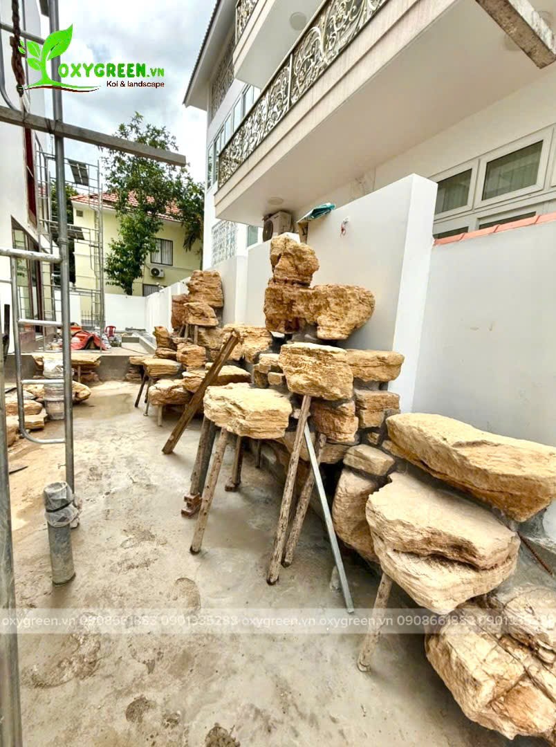 - Hòn non bộ bắt đầu được thi công bằng đá tự nhiên. Các khối đá được đưa vào công trình và xếp trực tiếp tại chỗ, vừa thi công vừa điều chỉnh để tạo dáng thế hài hòa, tránh cảm giác cứng hoặc rời rạc.